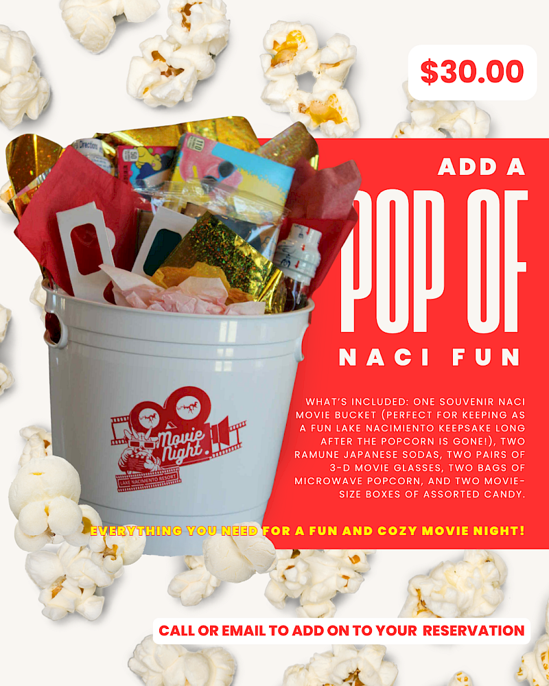 Everything you need for the perfect cozy movie night. This fun bundle includes a souvenir Naci movie bucket, a great Lake Nacimiento keepsake you can use again and again! along with two Ramune Japanese marble sodas, two pairs of 3-D movie glasses, two bags of microwave popcorn, and two movie-size boxes of assorted candy. Just add your favorite movie and enjoy the show.