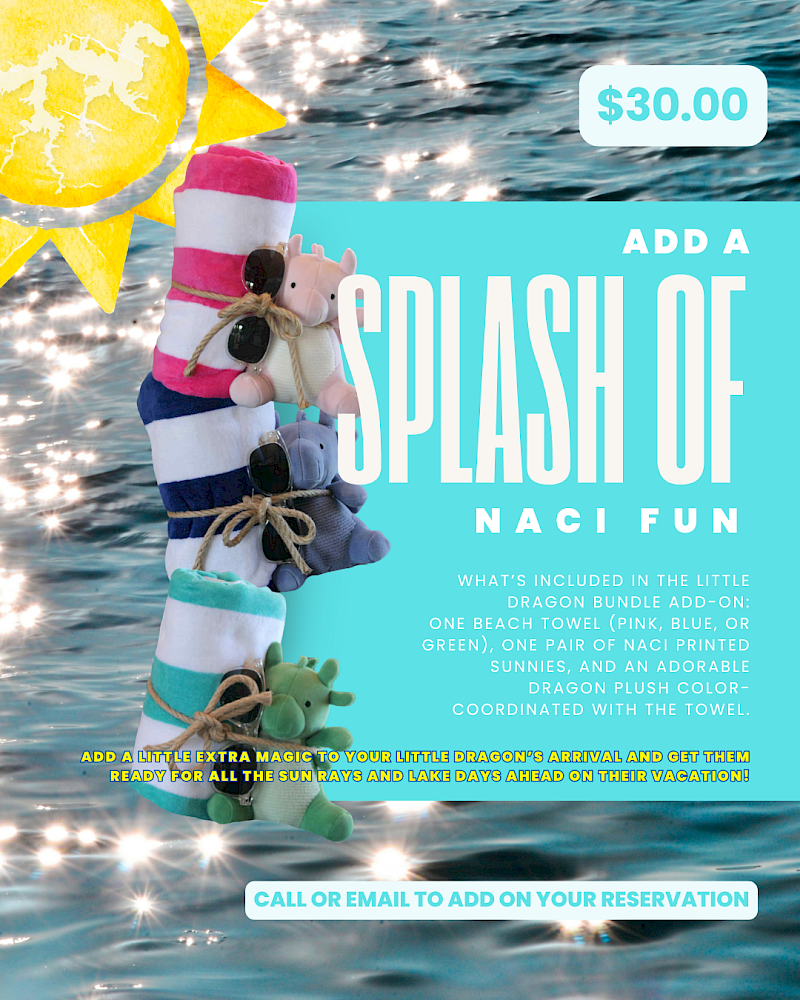 Make your Little Dragon’s arrival extra special with a fun bundle designed for sunny adventures at the lake. Each bundle includes a beach towel (pink, blue, or green), a pair of Naci printed sunnies, and an adorable dragon plush color-coordinated with the towel. It’s the perfect way to get your Little Dragon ready for all the sun rays and lake days ahead on their vacation.